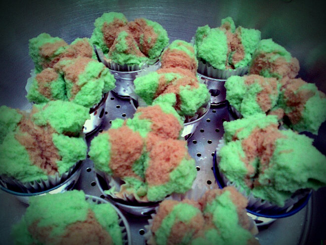 4. Sendokkan adonan ke cetakan bolu kukus yang dilapisi paper cup. Sendokkan adonan pasta bergantian, klo gw bikin paling bawah warna cokelat - hijau- cokelat - hijau, jadinya yaah kya di foto.