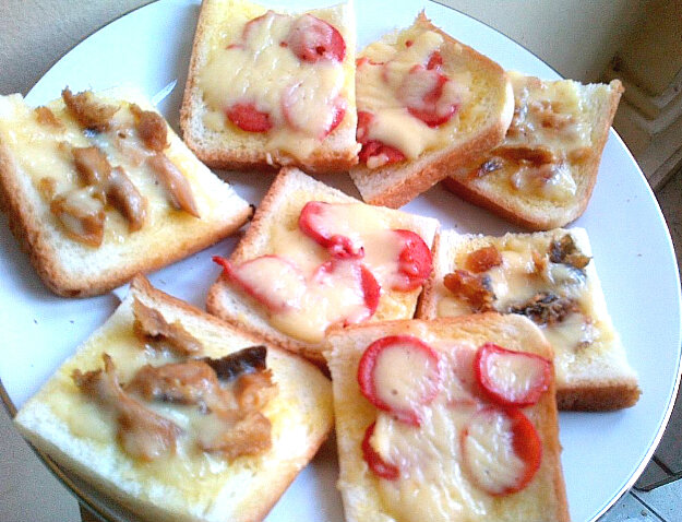 Tinggal tata topping diatas roti yang telah dioles mentega, lalu taro diatasnya keju yang telah dipotong kecil-kecil, kenapa bukan diparut? intinya sie biar irit saja, toh nantinya keju juga melted dan menyebar ke seluruh topping. Lalu tinggal di toast di atas teflon anti lengket dengan api kecil dan ditutup pake tutup panci.
