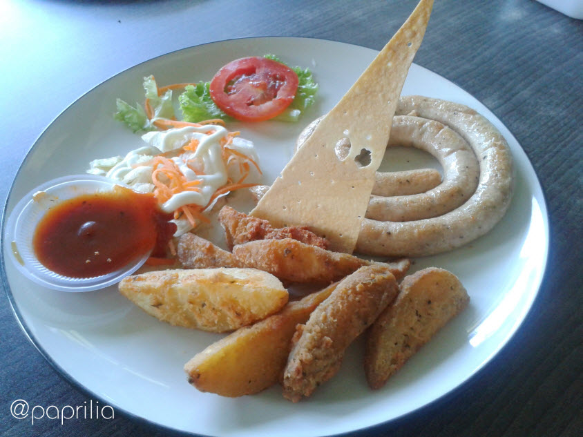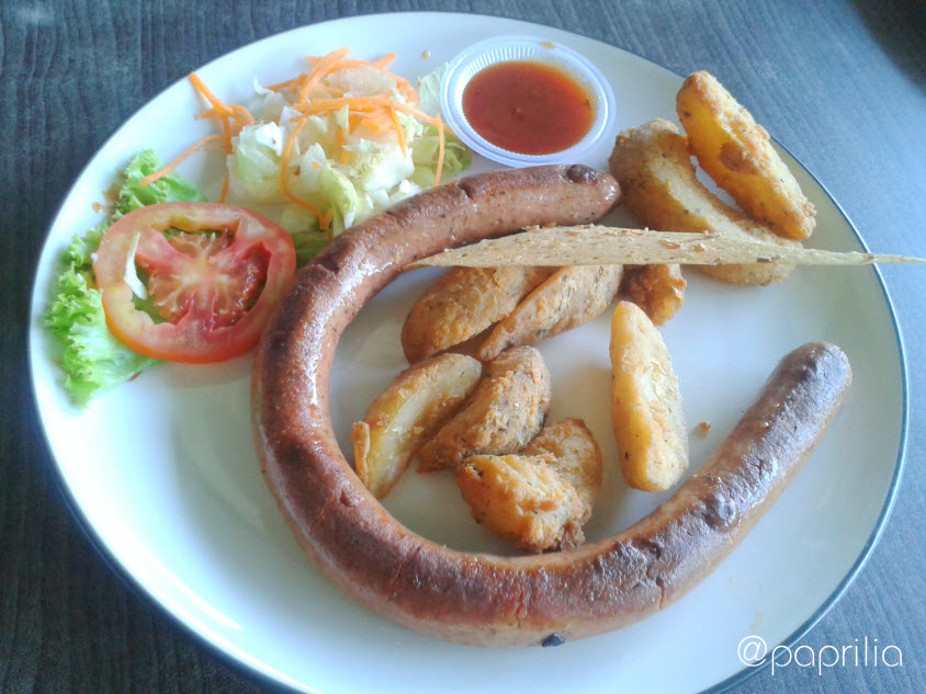 Untuk menu yang satu ini menyajikan sosis sapi yang juga homemade yang panjangnya lumayan diatas rata-rata dan berbentuk "U". Disajikan juga dengan potato wedges yang di fried, dan fresh salad. Sauce yang diberikan juga saus BBQ. Beda dengan menu sebelumnya hanya terletak di sosis'nya saja, Tapi walau ini sosis sapi, tapi tidak berbau amis lho. Dan di grilled dengan kesempurnaan tingkat tinggi.